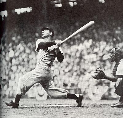 spur in his heel, Joe DiMaggio strokes a double in the 1949